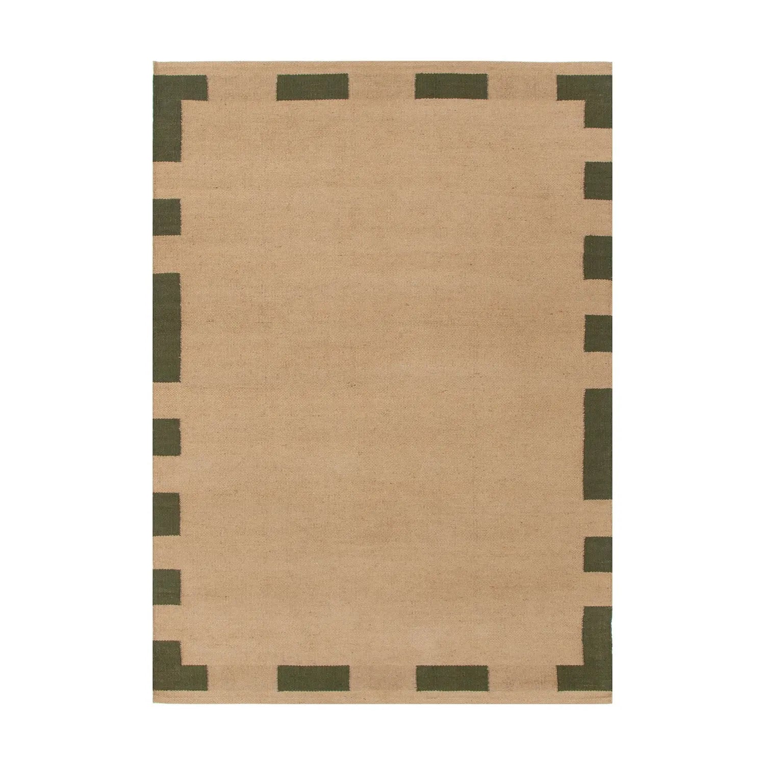 The Carlton Jute Rug is a beautifully handwoven piece that highlights the natural texture and charm of jute fibres. This rug features a clean, understated design with a neutral earthy brown base, complemented by a subtle green border. The geometric block detailing along the edges adds a modern, structured look while maintaining its organic appeal.