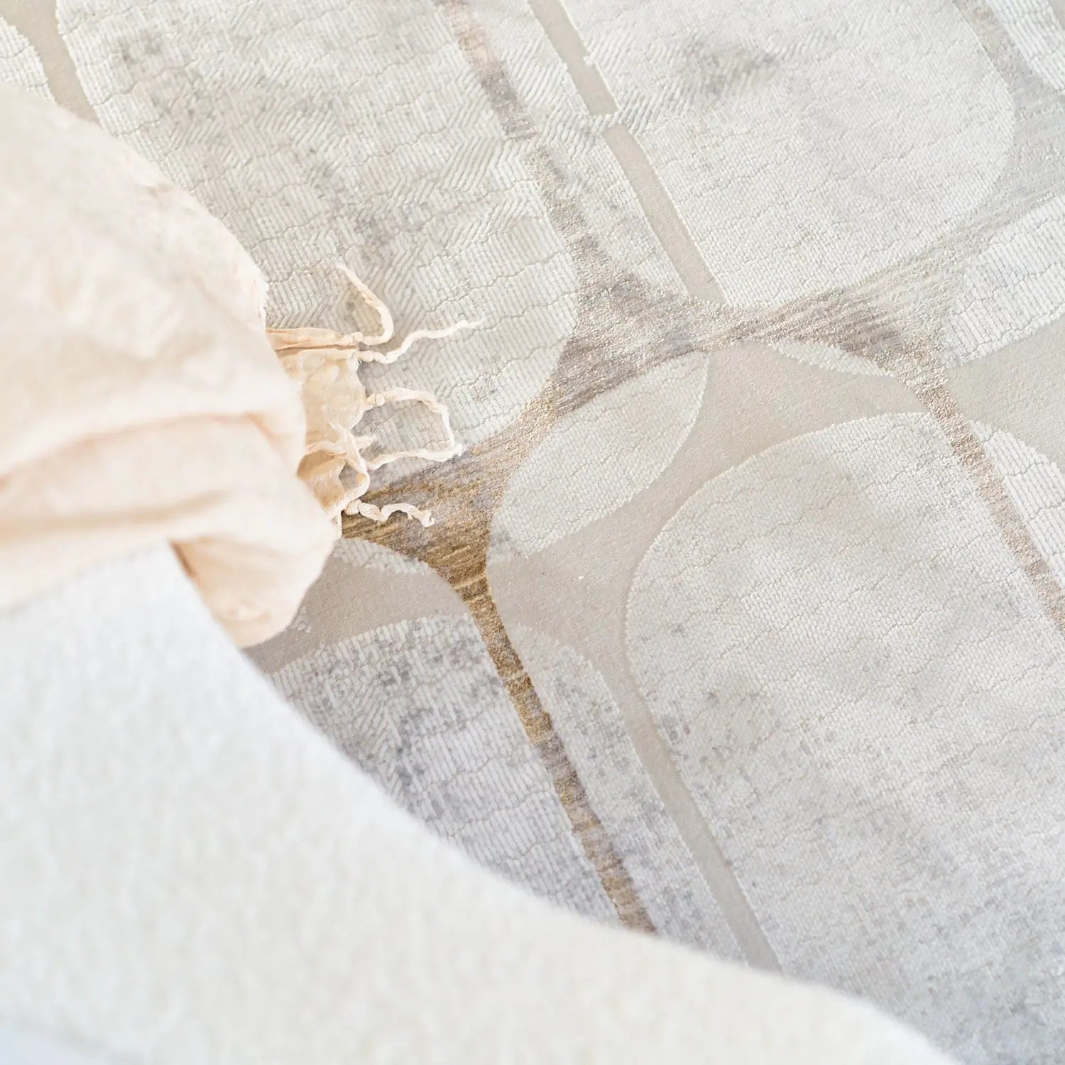 The Perisher Rug is a perfect fusion of contemporary design and timeless sophistication. Machine-knitted in Turkey from 100% polyester, it showcases a distressed geometric pattern in neutral beige, ivory, and soft silver hues, offering an effortlessly stylish look that complements a variety of interiors.